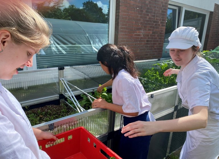 Nach der Ernte im Herbst 2025 wurde das Gemüse in den Küchen der Ernährung und Hauswirtschaft weiterverarbeitet und verzehrt. Außerdem werden die in den Küchen entstandenen Produkte in der Milchbar des C-Gebäudes der BBS 2 Aurich an SchülerInnen und LehrerInnen verkauft.