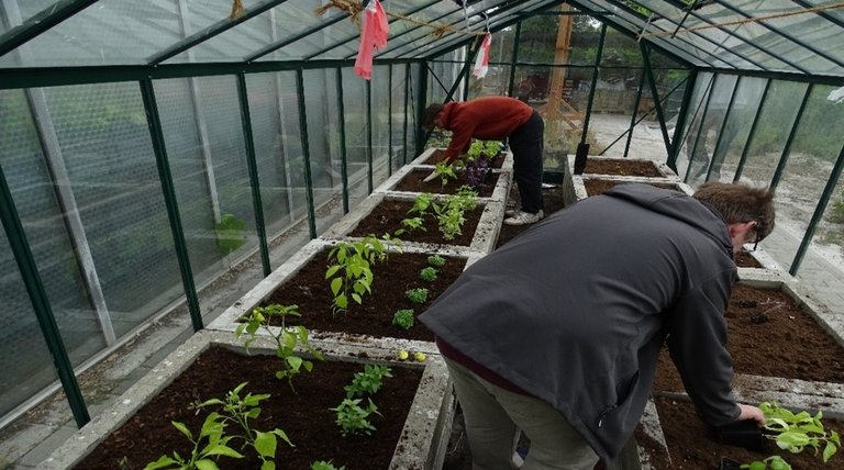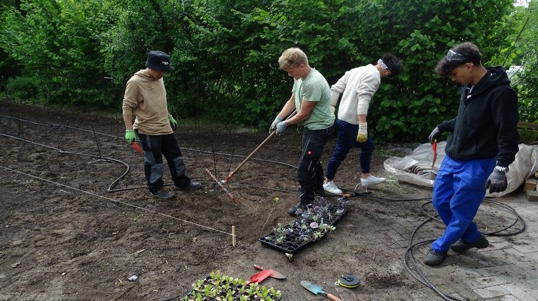 Auf der Freifläche am Parkplatz Gebäude C wurden u.a. Rotkohl, Kartoffeln und Kopfsalat gepflanzt sowie Buschbohnen und Porree ausgesät. Zudem wurden in zwei Gewächshäusern Tomaten, Paprika, Gurken und Auberginen gepflanzt.